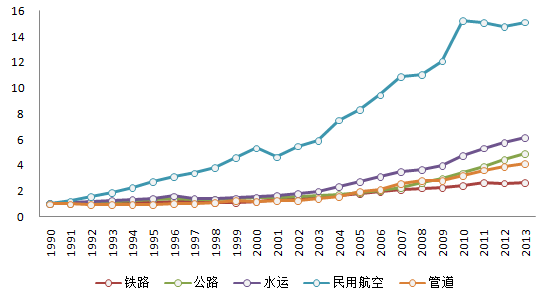 作為我國的經(jīng)濟命脈,鐵路、公路、水路、民用航空、管道等運輸方式的快速發(fā)展促進了我國各區(qū)域之間的人員及貨物交流,促進了資源的合理配置。在1990-2013年間,我國各主要運輸方式在貨運量方面取得了飛速的增長,其中航空運輸?shù)呢涍\量增速最為明顯;在結(jié)構(gòu)方面也在不斷調(diào)整,鐵路運輸貨運量呈現(xiàn)降低趨勢而水路運輸貨運量呈現(xiàn)上升趨勢。