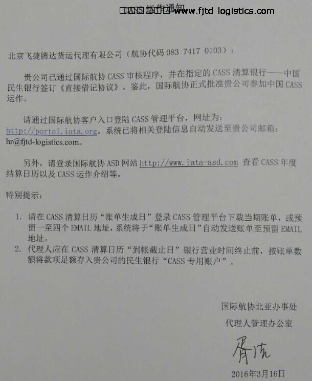 鑒此,國際航協(xié)正式批準貴公司參加中國CASS運作。