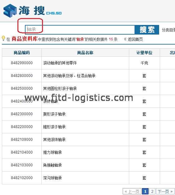 輸入“軸承”,點擊“搜索”,出來幾十條相關(guān)內(nèi)容(出來越多,說明這個品名越常見;越常見的品名,越容易確定HS編碼)