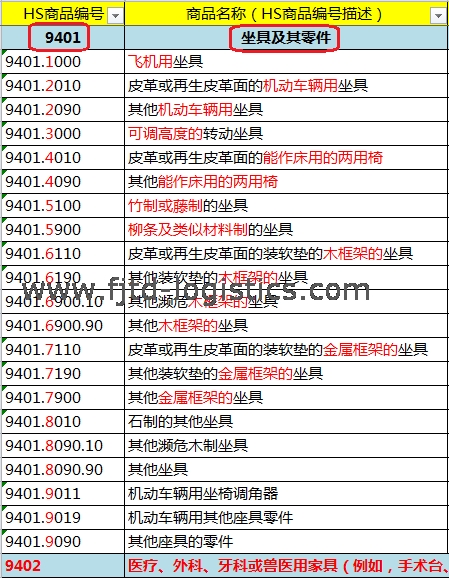 如:坐具(各種椅子、座椅)都歸入94.01(第94章第1個品目,此品目描述為“坐具(包括能做床用的兩用椅,但品目94.02的貨品除外)及其零件”),坐具(94.01)主要根據(jù)“用途”和“材質(zhì)”進一步細分: