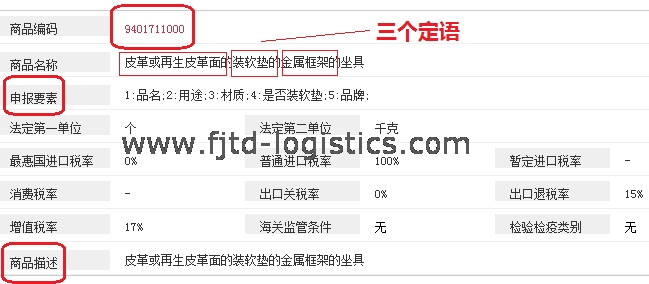 要特別注意其定語,如9401.7110.00,注意商品名稱(編碼描述)有好幾個定語(皮革或再生皮革面的、裝軟墊的、金屬框架的)