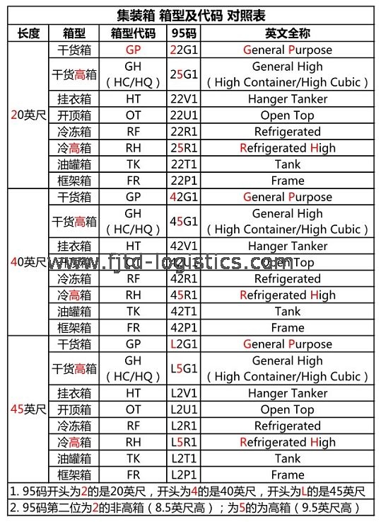 4)95碼第二位數字為2的非高箱(8.5英尺高);為5的為高箱(9.5英尺高)——這個要特別注意,5并不代表45英尺,如40HQ的95代碼為45G1,這個極易讓人誤以為是45HQ的柜子,其實45G1指的是40HQ