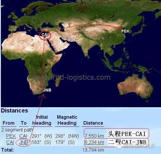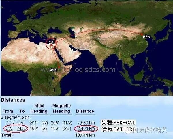 運(yùn)價(jià)表中CAI、ALY、ADD、JNB…對(duì)應(yīng)的價(jià)格,是北京到各點(diǎn)的全程運(yùn)價(jià)(PEK-CAI、PEK-ALY、PEK-ADD、PEK-JNB…),含中轉(zhuǎn)和二程費(fèi)用。其中,PEK-CAI是直飛,PEK-其他機(jī)場(chǎng)則是在CAI中轉(zhuǎn)。