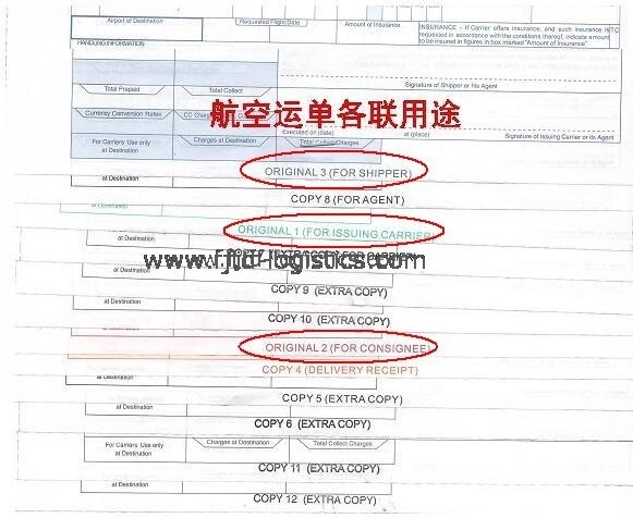 運單一般由三份正本(original)、三份副本(copy)和六份額外副本(extra copy)共十二聯(lián)組成。各聯(lián)的順序及用途如下(僅供參考,實際中使用的各聯(lián)順序和用途可能有所不同):