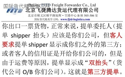換言之,你出口一票貨物,正常來說,提單委托人(提單shipper抬頭)應(yīng)該是你們公司,但客人要求提單shipper顯示成你們之外的第三方;或者客人的信用證是開給你們公司的,但是由于運(yùn)費(fèi)等原因,提單顯示成“雙抬頭”(貨代公司O/B你們公司)。為什么有人誤以為貨代提單是第三方提單?因?yàn)樘釂物@示成“雙抬頭”(貨代公司O/B你們公司),其實(shí)這不是貨代提單,只不過是提單顯示成“雙抬頭”(貨代公司O/B你們公司)的第三方提單而已。