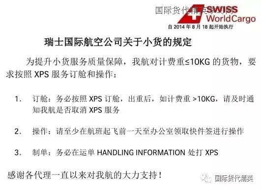 為提升小貨服務(wù)質(zhì)量保障,我航對計費(fèi)重≤10KG的貨物,要求按照XPS(快件)服務(wù)訂艙和操作: