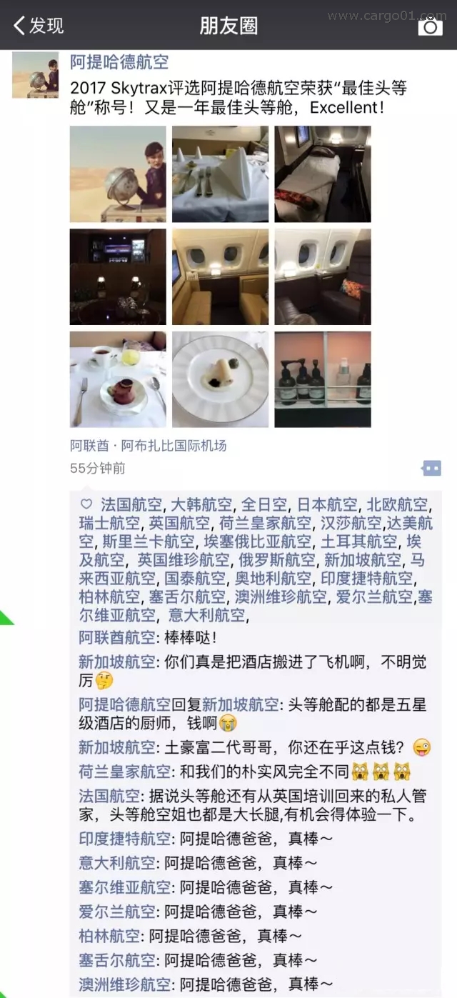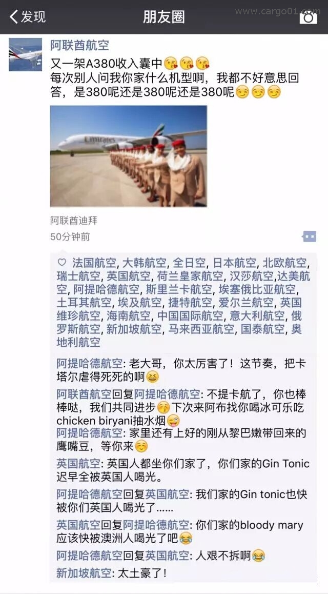 意大利航空、柏林航空、塞爾維亞航空、意大利航空、愛爾蘭航空、澳州維珍航空、印度捷特航空——阿提哈德收購的干兒子們,都統(tǒng)一的神回復(fù)“阿提哈德爸爸,真棒~”,真是讓人忍俏不禁??!