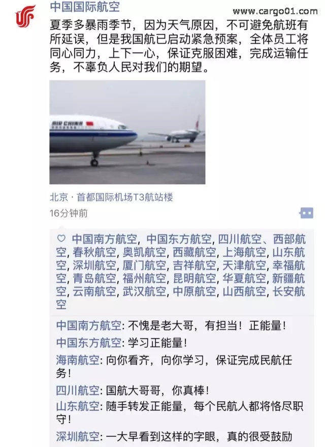 “夏季多暴雨季節(jié),因為天氣原因,不可避免航班有所延誤,但是我國航已啟動緊急預(yù)案,全體員工將同心協(xié)力,上下一心,保證克服困難,完成運輸任務(wù)嗎,不辜負(fù)人民對我們的期望”