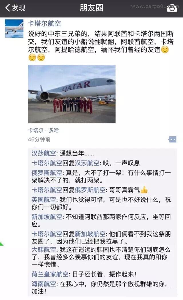 “說好的中東三兄弟的,結(jié)果阿聯(lián)酋和卡塔爾兩國斷交,我們友誼的小船說翻就翻,阿聯(lián)酋航空,卡塔爾航空,阿提哈德航空,緬懷我們曾經(jīng)的友誼?!?/p>