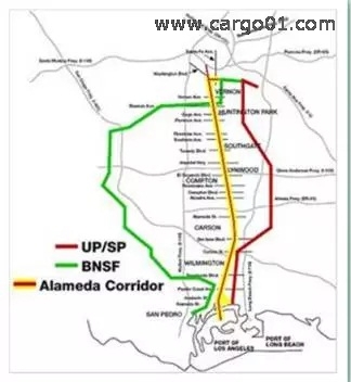洛杉磯港原有的海鐵聯(lián)運設施是由兩家知名的美國鐵路公司運營的。一是北伯靈頓圣塔菲鐵路公司(BNSF),通常美國同行把這家公司稱為西部鐵路公司,這家公司的貨運版圖主要集中在美國的中部和西部;另一個是聯(lián)合太平洋鐵路運輸公司(UP)。這兩家鐵路公司在該區(qū)原有四條單向鐵路引入港口,他們采用的重載列車最長可達2.5公里,四條鐵路與城市道路形成200個平面交匯道口,每天約有35列火車,以32公里/小時的時速通過這些道口。這種局面如不改善,港口與城市的矛盾將不堪設想。
