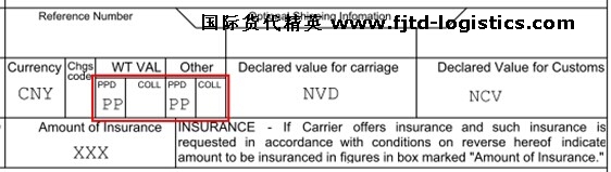 比如:航空運(yùn)單上有一欄“PPD”和“COLL”——“PPD”這一欄都填寫“PP”, “COLL” 這一欄都填寫“CC”。