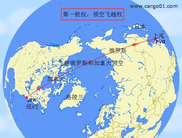 比如:上海(PVG)一 紐約(JFK),中途飛越俄羅斯和加拿大領(lǐng)空,那就要和俄羅斯和加拿大簽訂領(lǐng)空飛越權(quán),獲取第一航權(quán),否則只能繞道飛行,增加燃料消耗和飛行時間。有人可能會問:上海飛紐約不是飛越太平洋嗎?怎么會飛越俄羅斯和加拿大?因為地球是球體,上海到紐約飛“北極航線”距離最短,所以有的航班是這樣飛的。