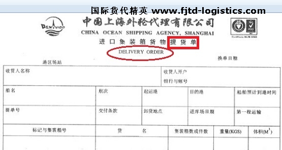 D/O是Delivery order的首字母簡(jiǎn)稱,意思為提貨單,因?yàn)檫M(jìn)口時(shí)才有,也叫進(jìn)口提貨單,常見(jiàn)的是進(jìn)口集裝箱貨物提貨單。如圖:
