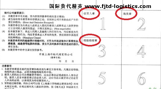 如圖:第一個(gè)格子蓋收貨人章,第二個(gè)格子蓋海關(guān)章,第三個(gè)格子蓋檢驗(yàn)檢疫章……還有幾個(gè)格子,普通貨物一般用不到,是預(yù)留給特殊貨物的。只有在檢疫、報(bào)關(guān)等必要手續(xù)都完成之后,收貨人才可以提到貨。比如,如果沒(méi)有海關(guān)章(意味著報(bào)關(guān)還沒(méi)完成,海關(guān)還沒(méi)放行),收貨人是提不走貨物的。