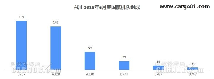 截止2018年6月底,國航客運飛機總數(shù)411架,占國內(nèi)機隊總數(shù)的12.8%;截止2018年6月底,國航B737,A320數(shù)量最多,分別為159架、141架。