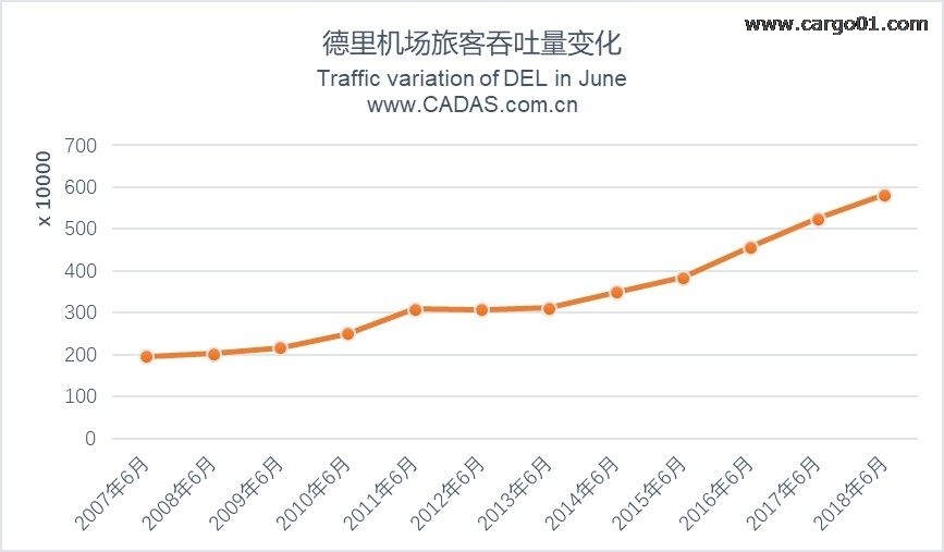 2017年旅客吞吐量全球排名前15的機(jī)場(chǎng),2018上半年旅客吞吐總量均超過(guò)3000萬(wàn)人次,平均增速為4.84%。按照2018上半年旅客吞吐量初步排名,2018年排名前15的機(jī)場(chǎng)旅客吞吐量平均增速為5.08%,其中德里機(jī)場(chǎng)增速達(dá)13.4%,增速最快。以德里機(jī)場(chǎng)近年6月的旅客吞吐量為例,自2014年起,德里機(jī)場(chǎng)6月份的旅客吞吐量處于逐年遞增狀態(tài),平均增速達(dá)13.3%。2018上半年排名前15機(jī)場(chǎng)中,首爾機(jī)場(chǎng)增速12.16%排第二,浦東機(jī)場(chǎng)、廣州機(jī)場(chǎng)、北京首都機(jī)場(chǎng)增速位列前五。