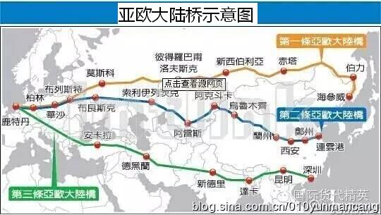 2、東起江蘇連云港西至荷蘭鹿特丹的新歐亞大陸橋鐵路運(yùn)輸(也稱(chēng)第二歐亞大陸橋)。