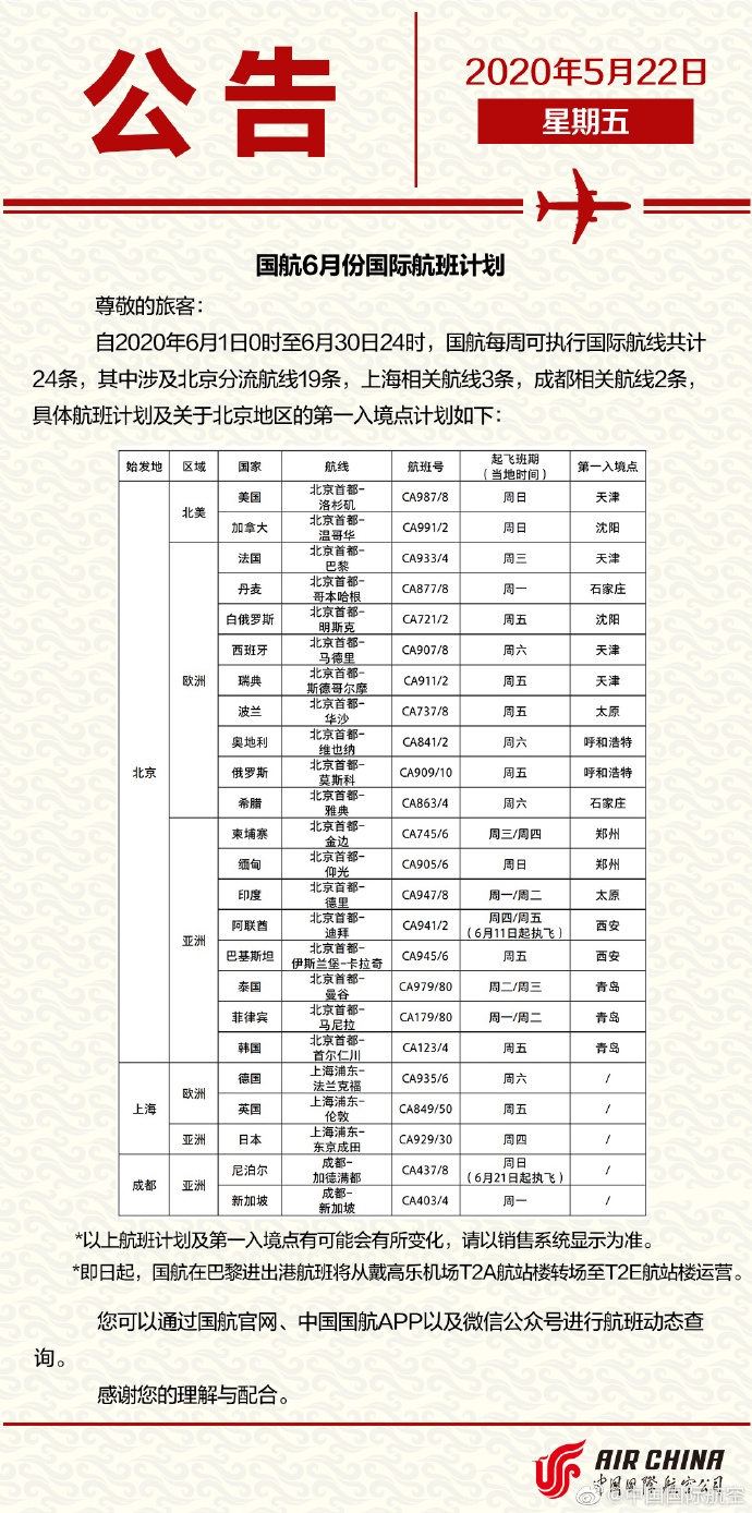 自2020年6月1日0時至6月30日24時,國航每周可執(zhí)行國際航線共計24條,其中涉及北京分流航線19條,上海相關(guān)航線3條,成都相關(guān)航線2條,具體航班計劃及關(guān)于北京地區(qū)的第一入境點(diǎn)計劃如下。
